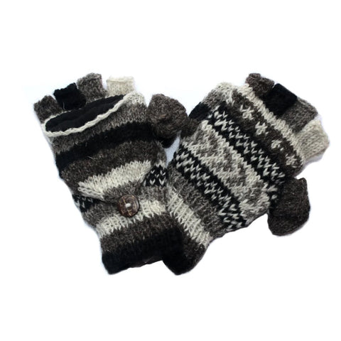 Fingerless gloves with mitten flap hand-knitted in lambswool -- perfect for wearing this winter! Keep hands warm with these stylish and ethical gloves plus you can easily use your phone with the mitten flap securely buttoned back. One size fits most adult hands.